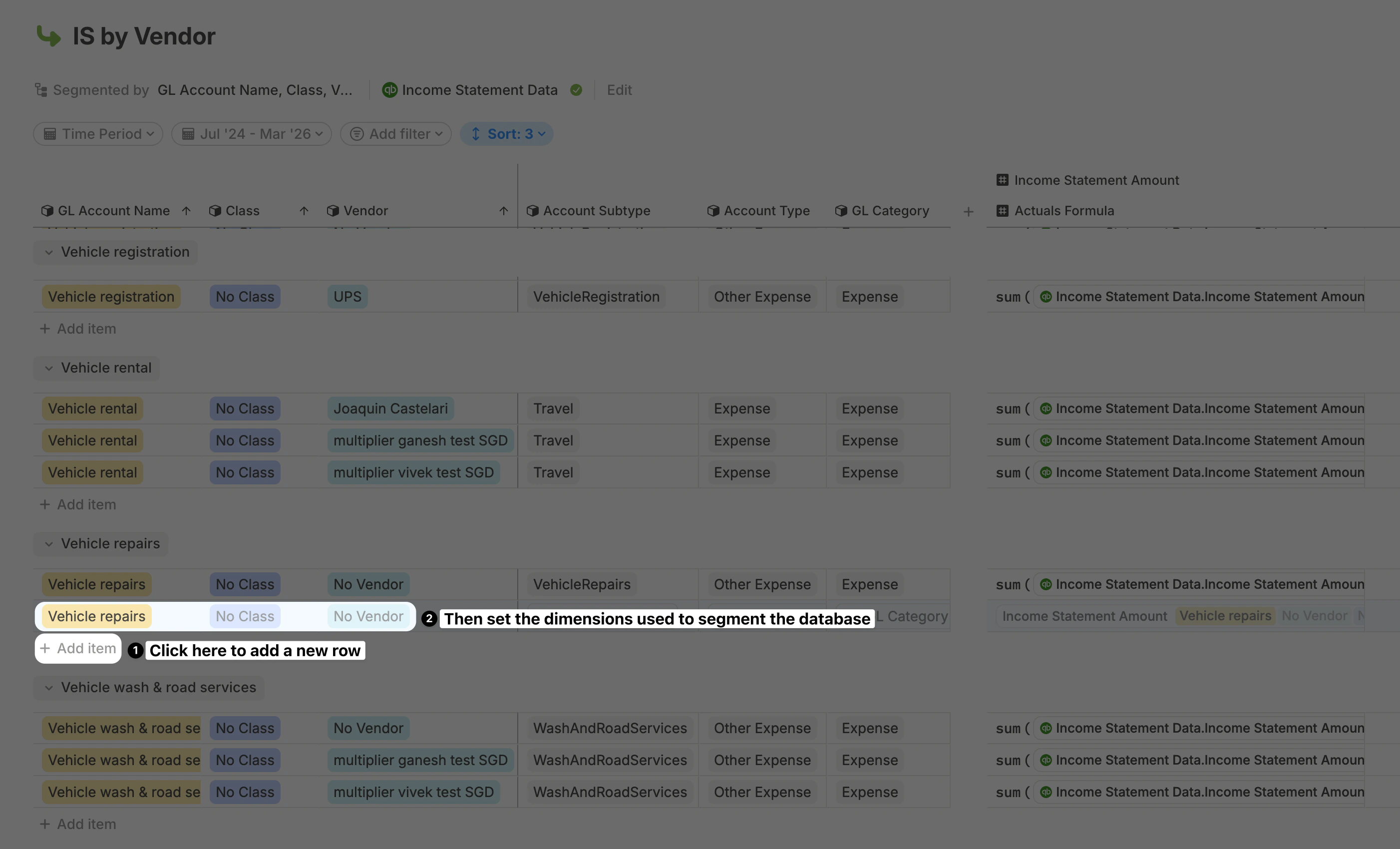 If you need to manually add a row to a database—for example, a new vendor in an Income Statement by Vendor database or a new assumption in an assumptions database—click + Add item. After adding the row, set values for the dimensions used in the Segment by for this database.