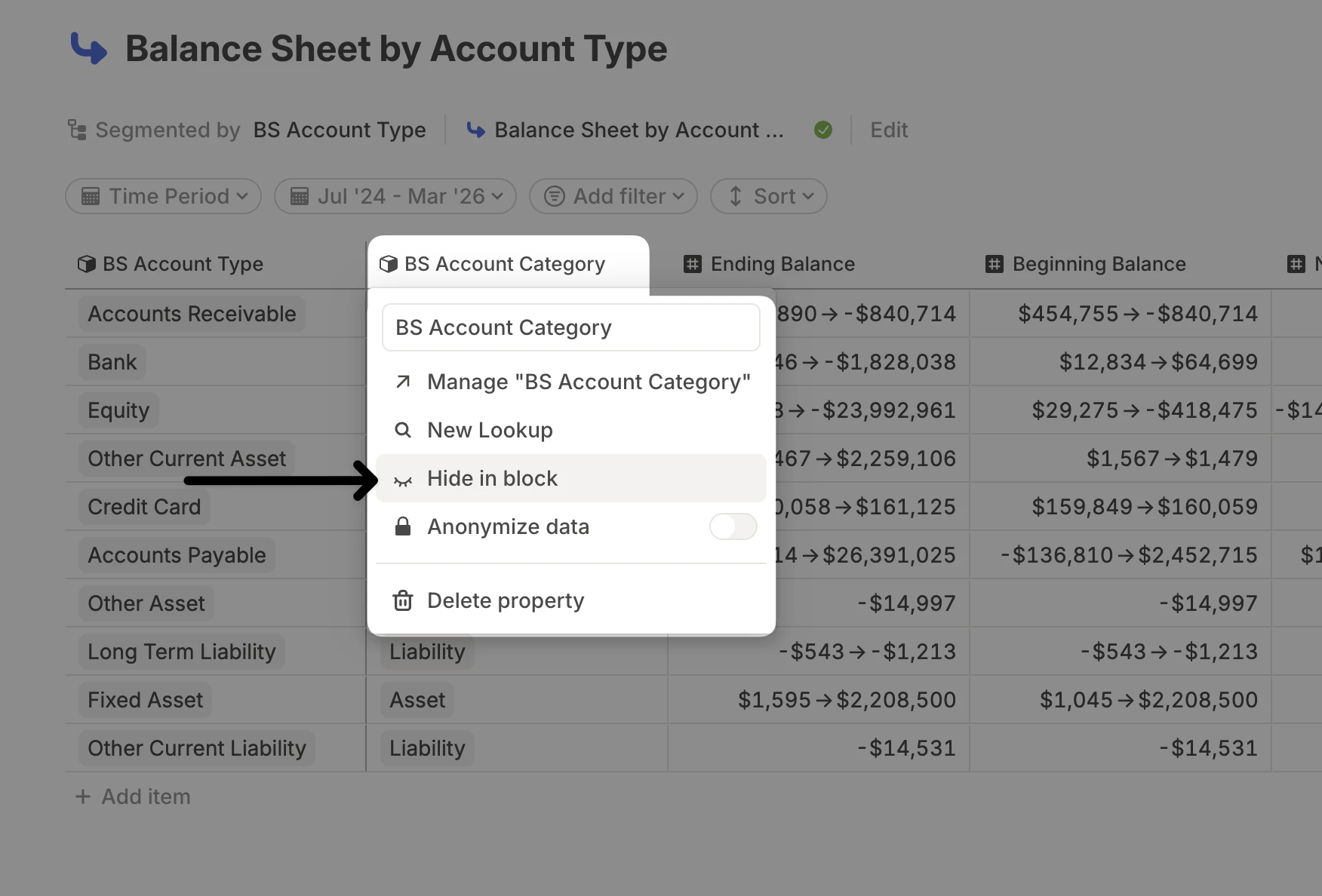For a more compact view of your data, you can hide columns that are not always relevant and show them only when needed. You can do this by clicking on the column name in the database header and selecting Hide in block.