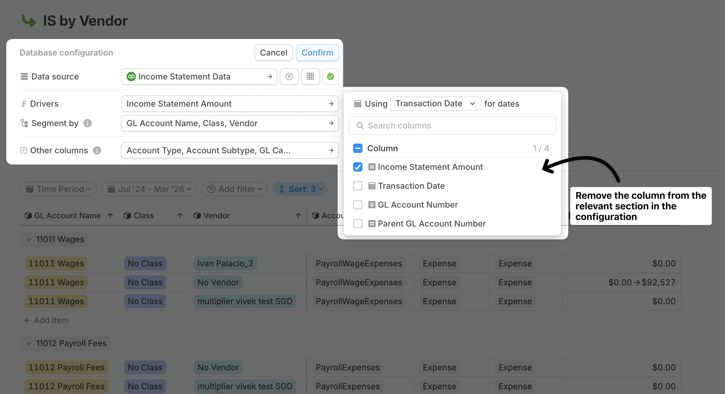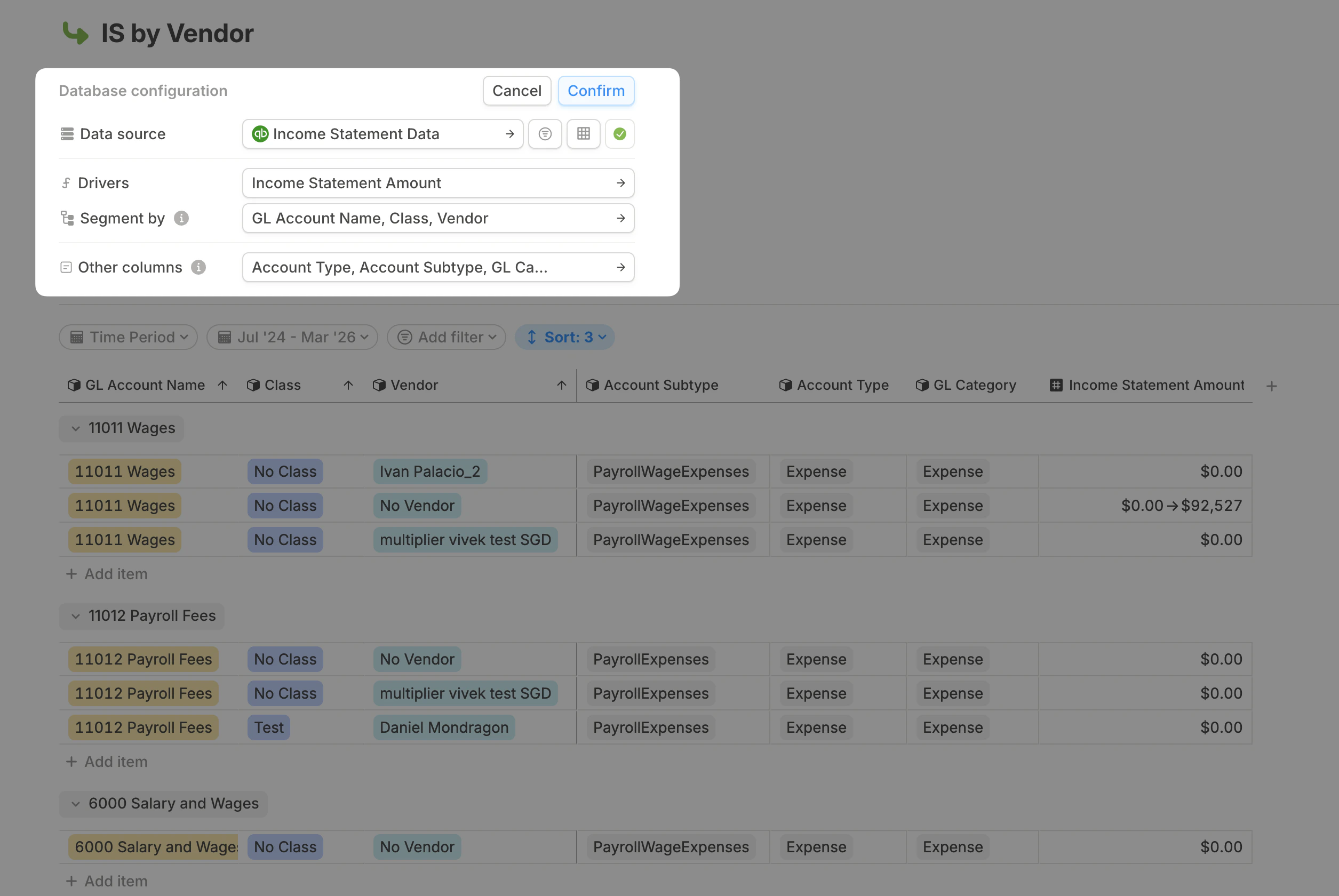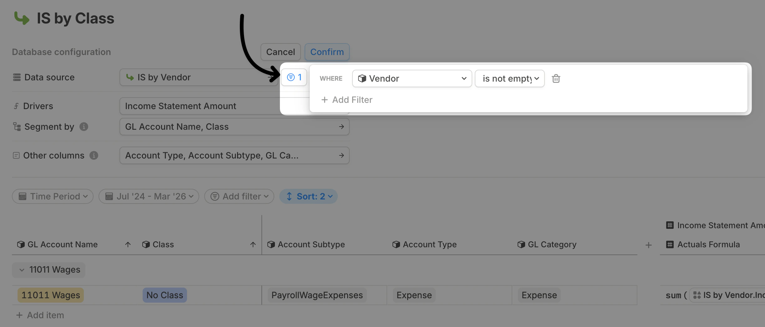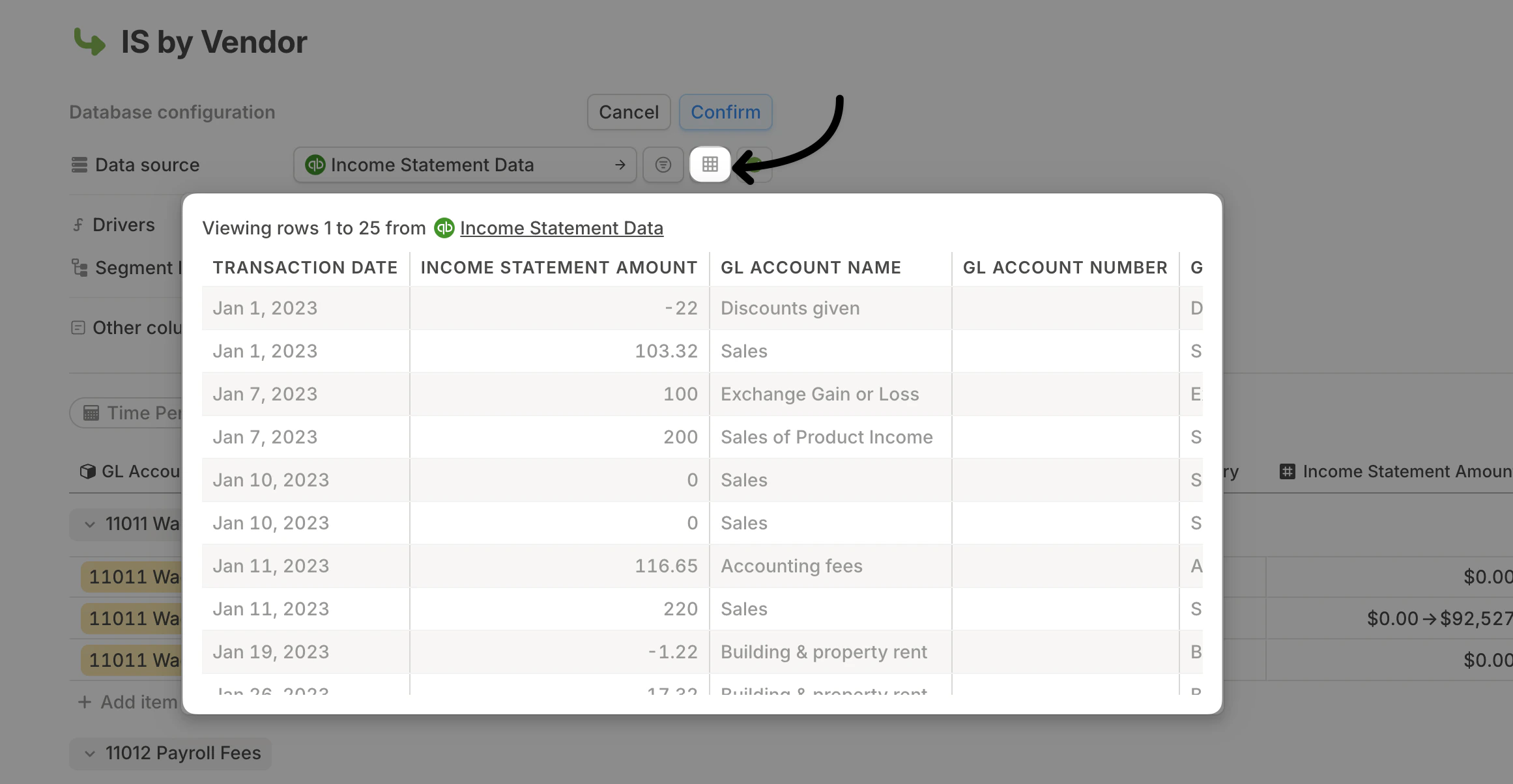 When you connect an integration, your data flows into a database. You can then create additional databases that pull from this original database and aggregate the data at different levels. For example, if you import GL data with vendor-level details from QuickBooks, NetSuite, or Xero into a database, you can build another database that pulls from it and aggregates the data by department or class.Creating a database