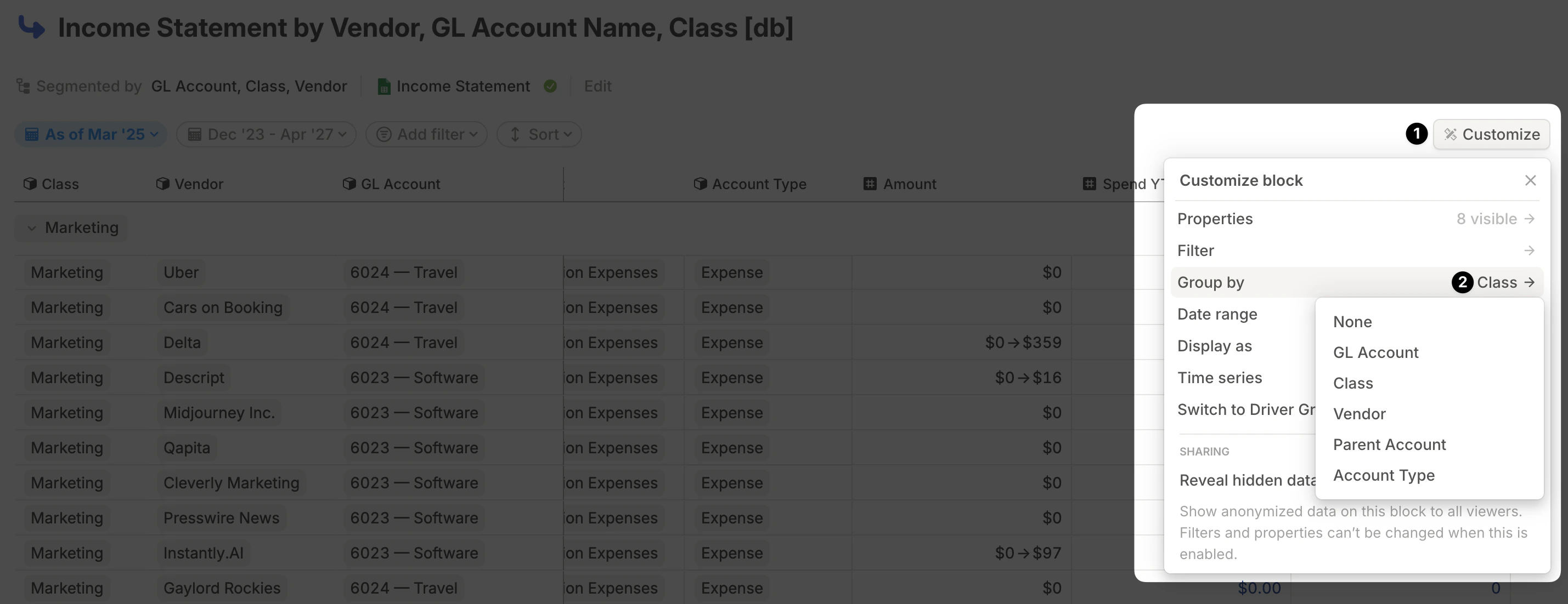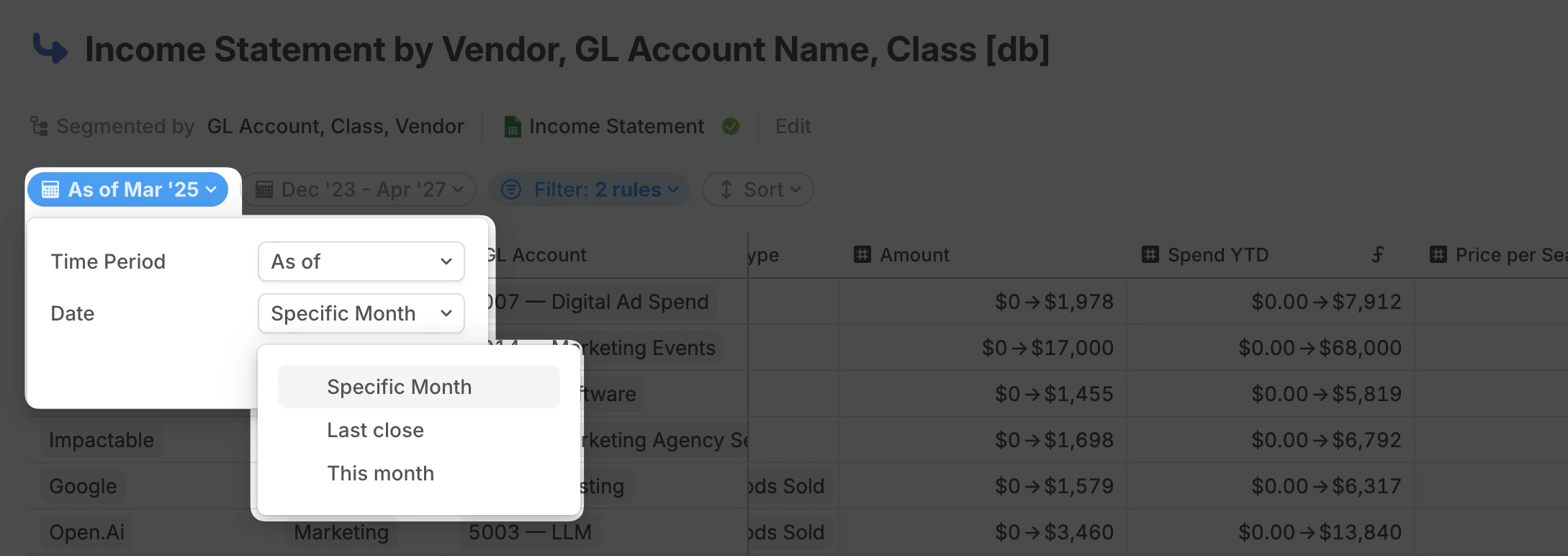 For better readability, you can group your database rows by any of your dimensions. Click the Group by pill at the top of the database (next to filter and sort), then select the dimension you want to group by. Similar to filtering and sorting, grouping by a driver evaluates data based on this month’s values. You can change this to group based on last close month or a specific custom month by selecting the date option in the group by menu.