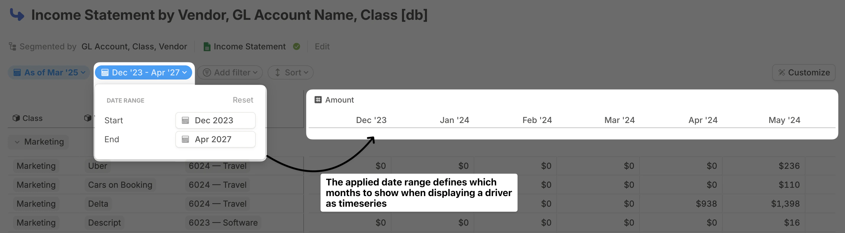 Changing the date range for a database primarily affects drivers, as they hold data that can change over time and be displayed as a time series. Dimensions, on the other hand, are static and remain unaffected by date range changes. When displaying one or all drivers as a time series, each month within the selected date range is shown as a separate column. To change the date range, click on the “Date range” pill at the top of the database and select the start and end months.