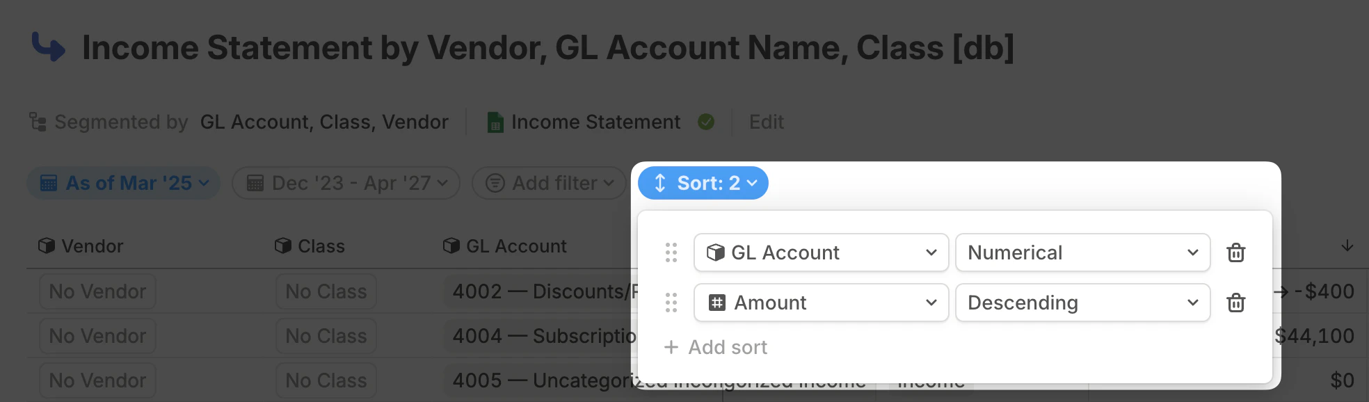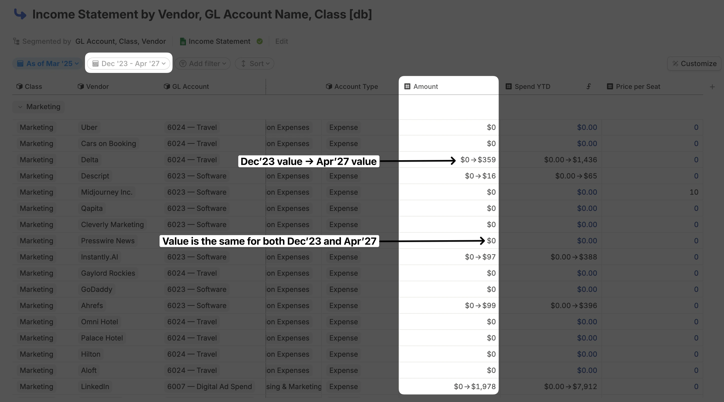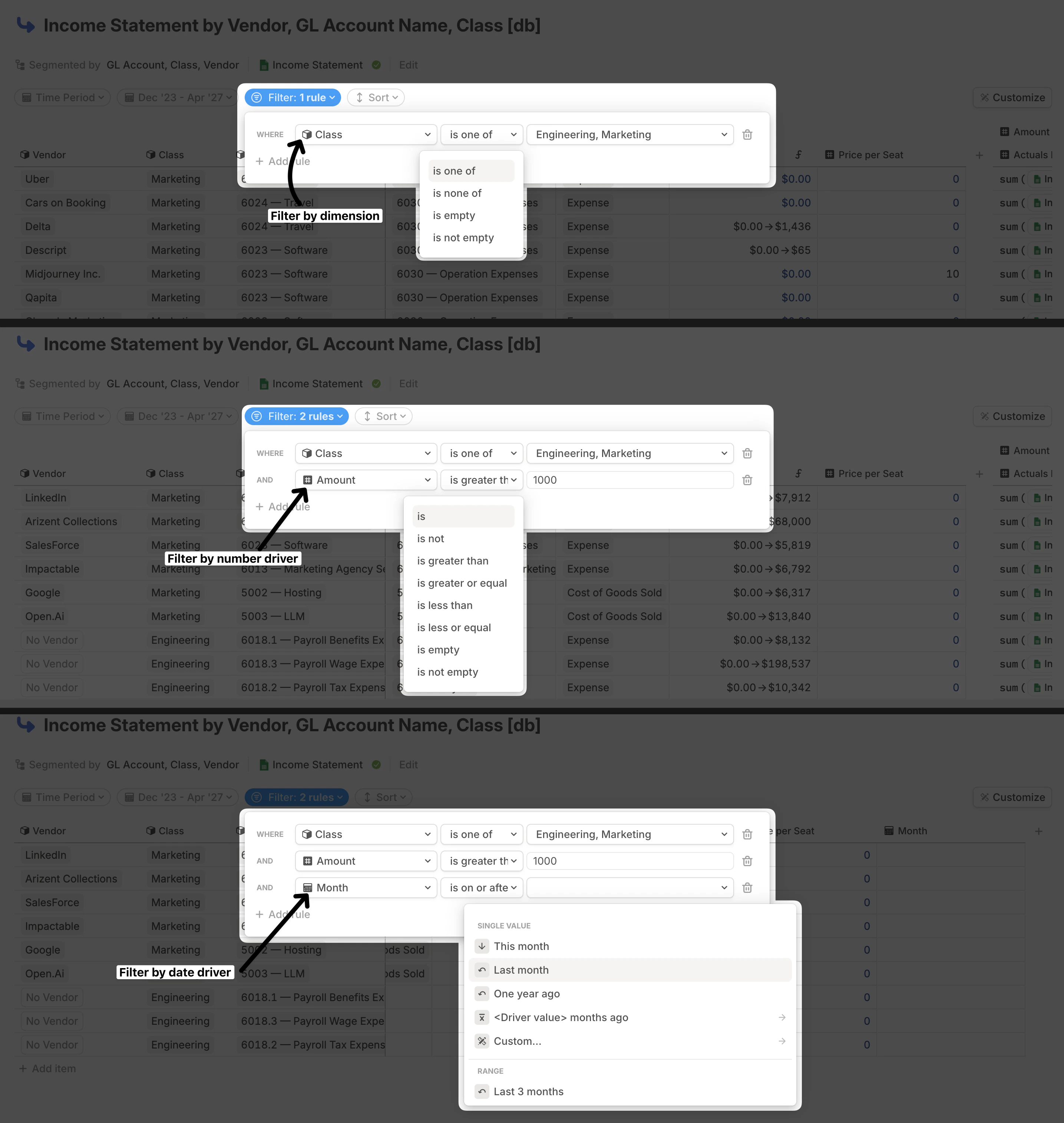 Filtering is useful when modifying or debugging database data, allowing you to focus on a specific subset of rows. It also helps when adding a database block to a page to share with your team without exposing the entire database. For example, you can filter a GL database by department, so each department head only sees the vendors they are responsible for. To apply a filter, click on the Add filter pill at the top of a database, then select the dimension or driver you want to filter by.- Filtering by a dimension allows you to use operators like is one of, is none of, is empty, and is not empty. When using is one of or is none of, you can select one, multiple, or all dimension values.