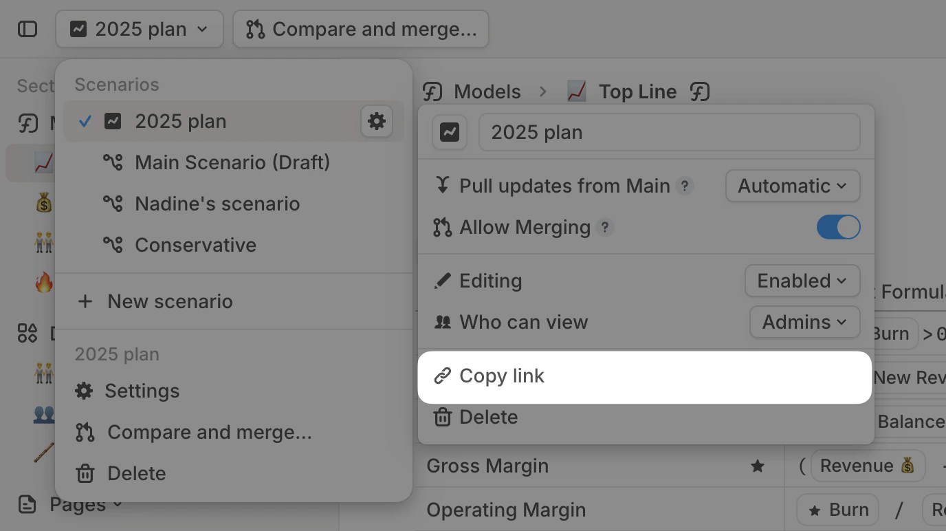- Copy link – Share any scenario with your team by sharing its link.