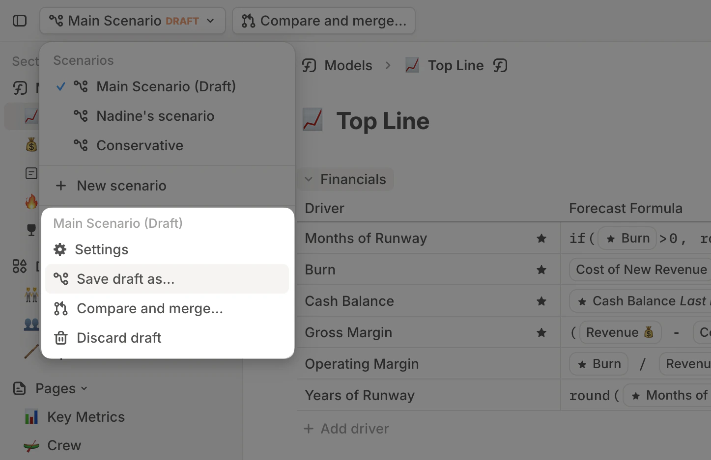 Your main scenario is your live, official model. To protect it from accidental changes, Runway automatically creates a draft scenario anytime you make data edits. Once in draft, all your edits remain local—they won’t affect main or any other scenario unless you merge them.